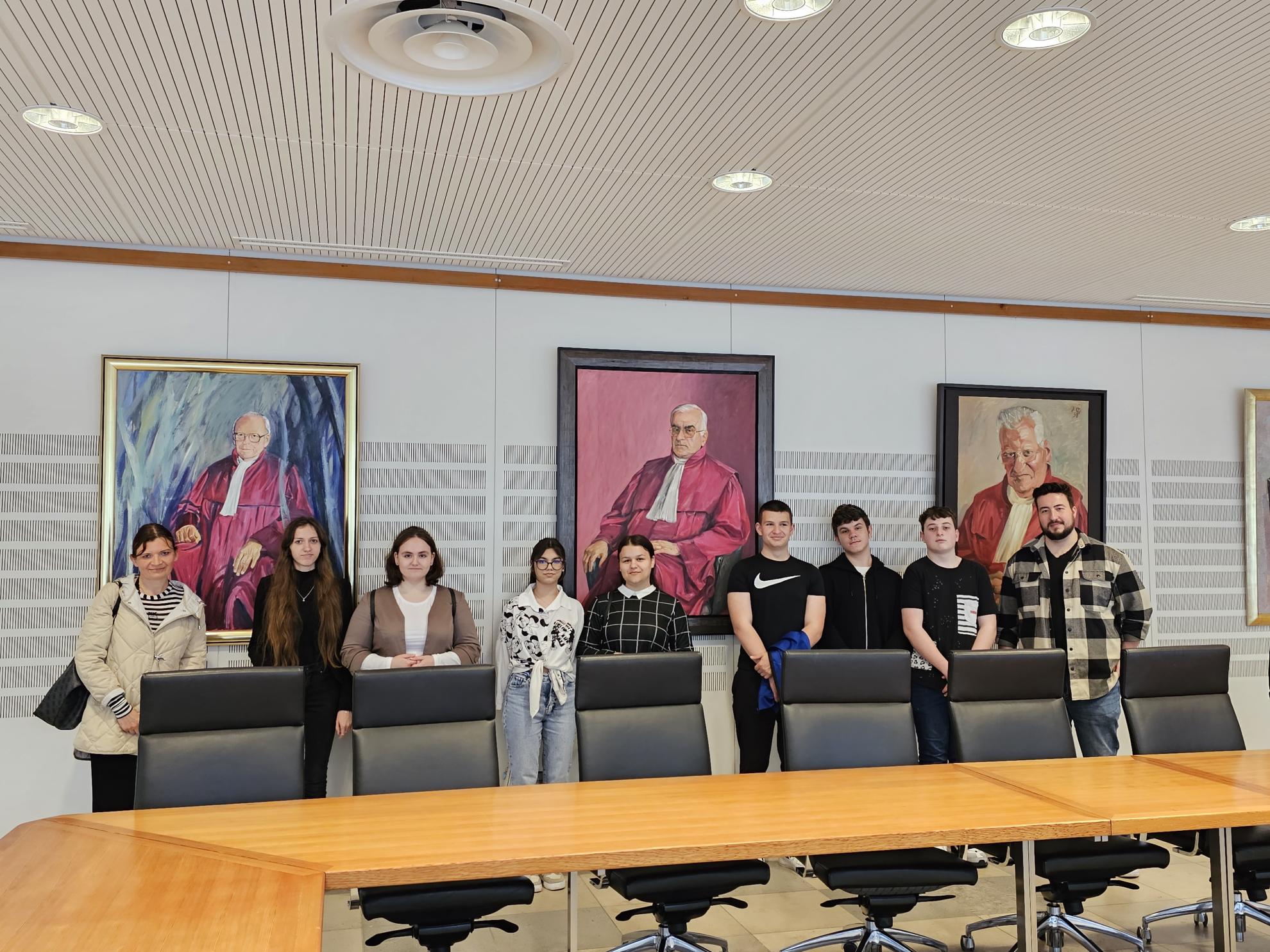 Nach einem herzlichen Empfang von Regierungsamtfrau Joachim wurde die Klasse durch das Gebäude geführt und konnte dabei neben dem Foyer mit vielen Porträts ehemaliger Verfassungsrichter, dem Sitzungssaal und den Konferenzräumen auch eine kleine Ausstellung über die Geschichte des Gerichts besuchen.